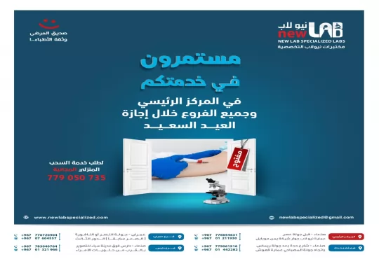 "وفرنا عليكم الجهد والعناء فقط بمجرد اتصال بخدمة السحب المنزلي المجاني من مختبرات نيولاب التخصصية"